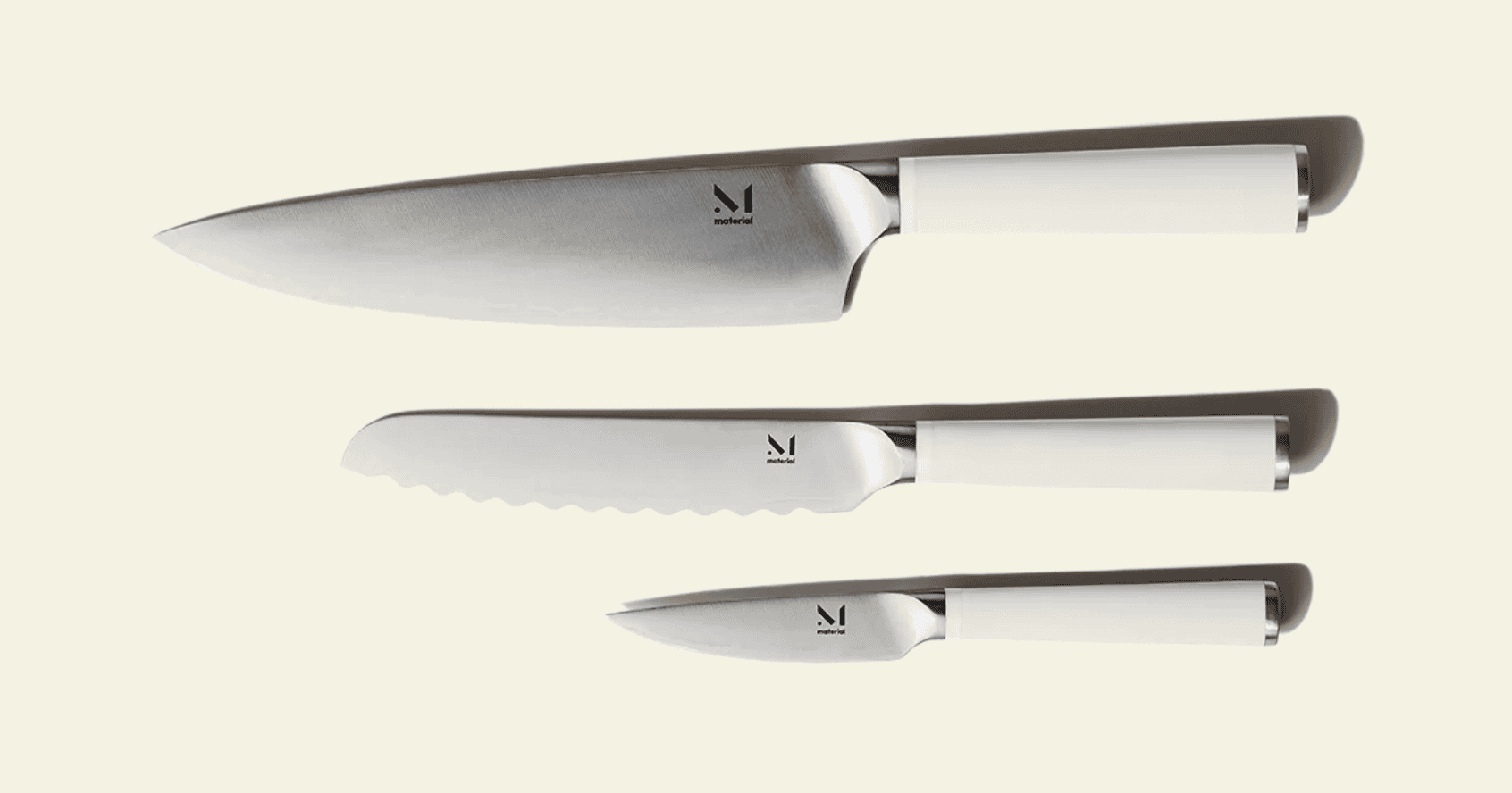 I own a variety of kitchen knives, but the three in this set from Material are my absolute favorites. The set includes an 8-inch chef’s knife (my go-to chopping knife), a 6-inch serrated knife (perfect for slicing bread and tomatoes!), and a 4-inch paring knife (great for slicing apples for our kiddo). I think this set covers all the chopping and slicing needs of most home cooks, and it would be a fantastic gift for someone looking to upgrade their knives. I love that it comes in three fun colors!