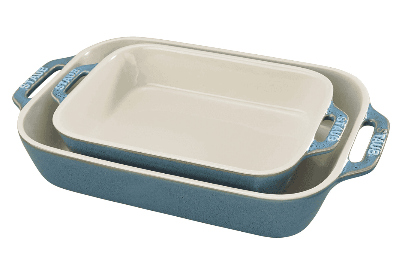 I think this baking dish set is hands down one of the best kitchen gifts. It includes a small 7.5×6-inch baking dish and a larger 10.5×8-inch one. I use mine constantly for sweet and savory dishes like fruit crisps and crumbles, casseroles, lasagna, eggplant Parmesan, and more. I typically serve food straight out of them at the table—they look so pretty! Their porcelain-enamel finish is scratch-resistant, and their stoneware material retains heat incredibly well. Any home cook would love them!